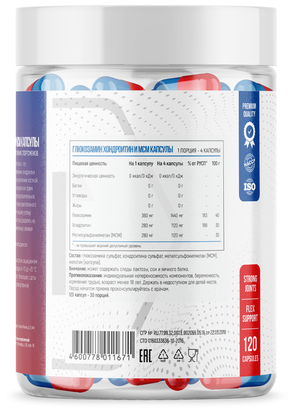 желатин (капсула, метилсульфонилметан (MCM), глюкозамин, хондроитин.