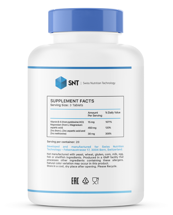 ZMA - комплекс, включающая в себя цинк, магний и витамин B6. Цинк необходим для правильной работы гормональной системы, улучшает выработку тестостерона, укрепляет иммунитет, контролирует жирность кожи. Магний улучшает усвоение цинка, является сильным антиоксидантом, расслабляет нервную систему, играет важную роль в сокращении мышц. Вместе с витамином B6 стимулирует синтез белка в организме.