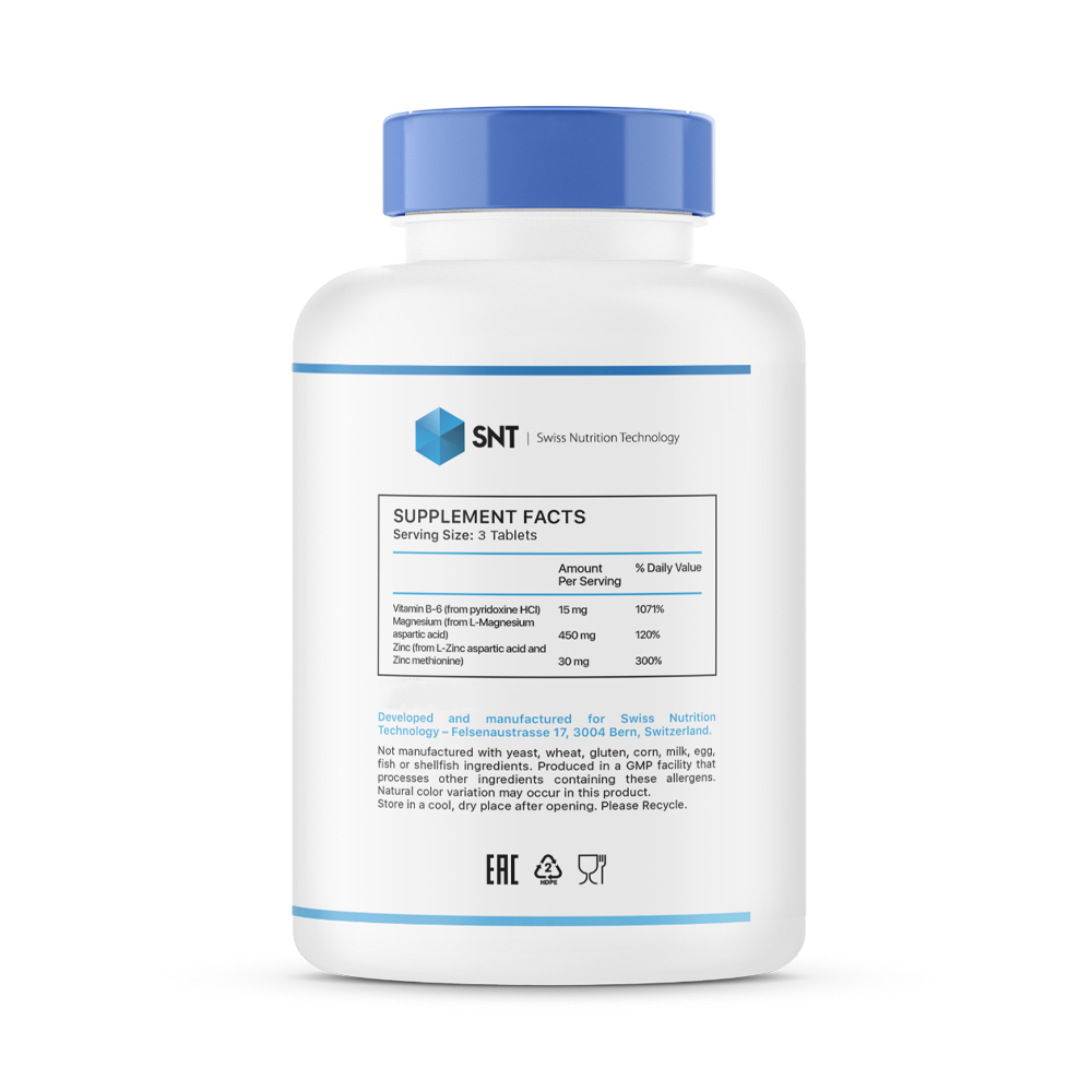 ZMA - комплекс, включающая в себя цинк, магний и витамин B6. Цинк необходим для правильной работы гормональной системы, улучшает выработку тестостерона, укрепляет иммунитет, контролирует жирность кожи. Магний улучшает усвоение цинка, является сильным антиоксидантом, расслабляет нервную систему, играет важную роль в сокращении мышц. Вместе с витамином B6 стимулирует синтез белка в организме.
